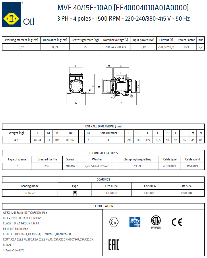VIBRATOR ELECTRIC MVE 40/15 - 3 PH - 4 POLES - 1500 RPM - 220-240/380-415 V -50 Hz