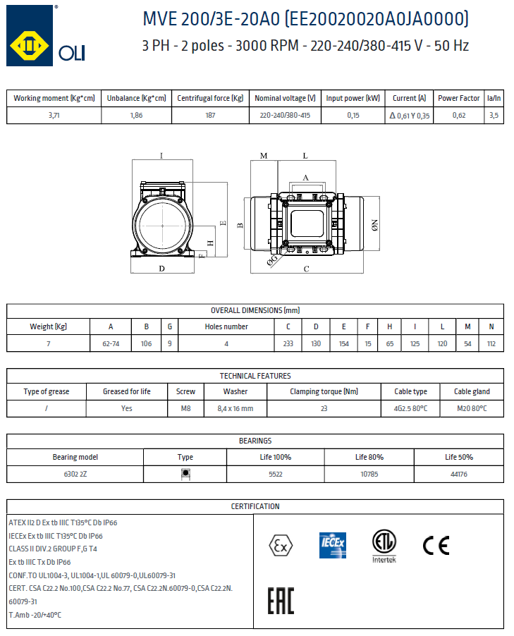 VIBRATOR ELECTRIC MVE 200/3 - 3 PH - 2 POLES - 3000 RPM - 220-240/380-415 V -50 Hz